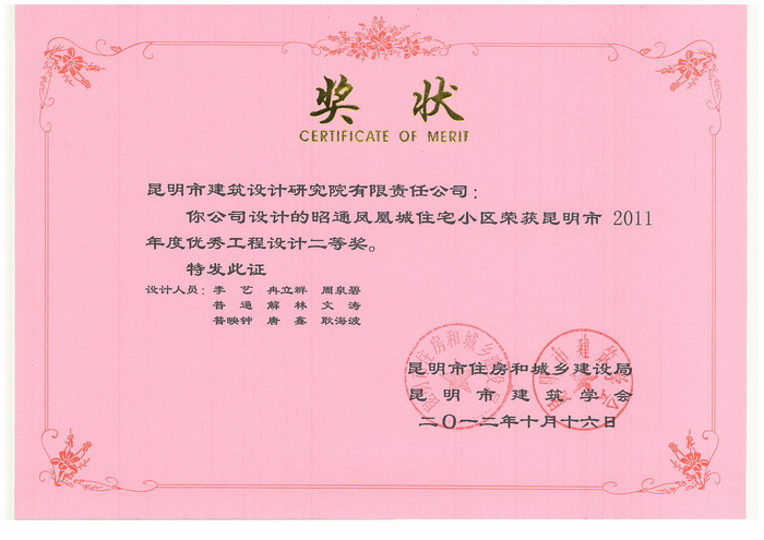 “昭通鳳凰城住宅小區(qū)”榮獲市2011年度優(yōu)秀工程設(shè)計(jì)二等獎(jiǎng)