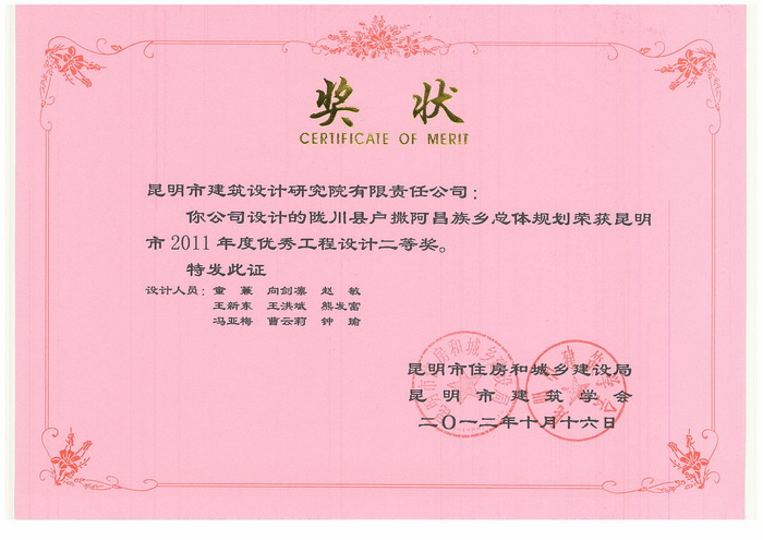 “隴川縣戶撒阿昌族鄉(xiāng)總體規(guī)劃”榮獲市2011年度優(yōu)秀工程設(shè)計(jì)二等獎(jiǎng)