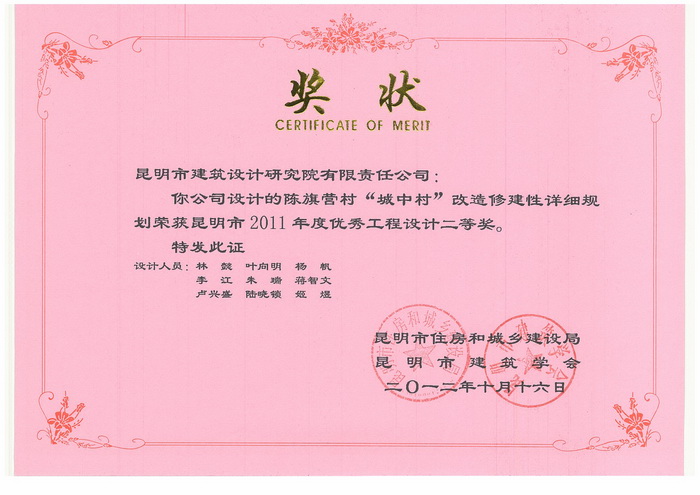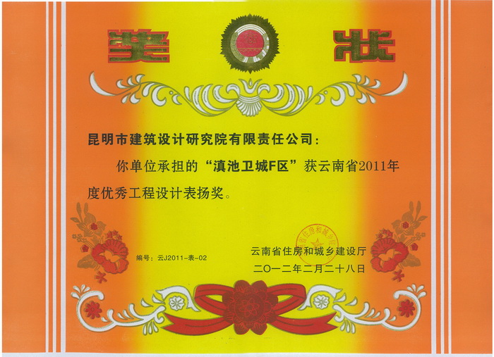 “滇池衛(wèi)城F區(qū)”獲云南省2011年度優(yōu)秀工程設(shè)計(jì)表?yè)P(yáng)獎(jiǎng)