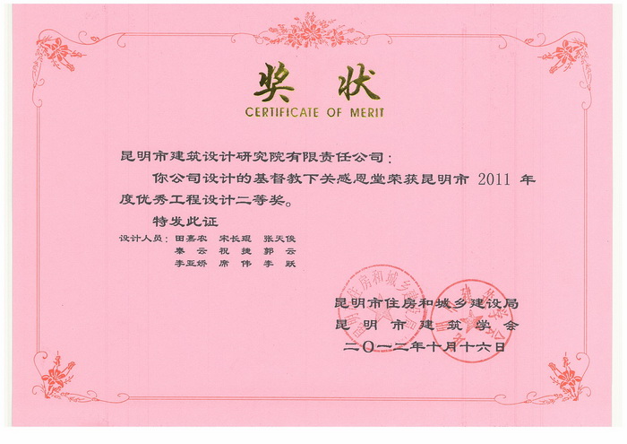 “基督教下關(guān)感恩堂”榮獲市2011年度優(yōu)秀工程設(shè)計(jì)二等獎(jiǎng)