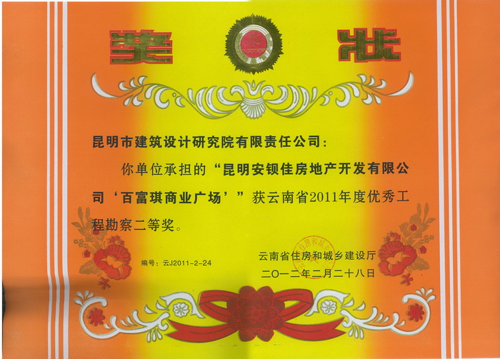 “昆明安鋇佳房地產(chǎn)開(kāi)發(fā)有限公司‘百富琪商業(yè)廣場(chǎng)’”獲云南省2011年度優(yōu)秀工程勘察二等獎(jiǎng)