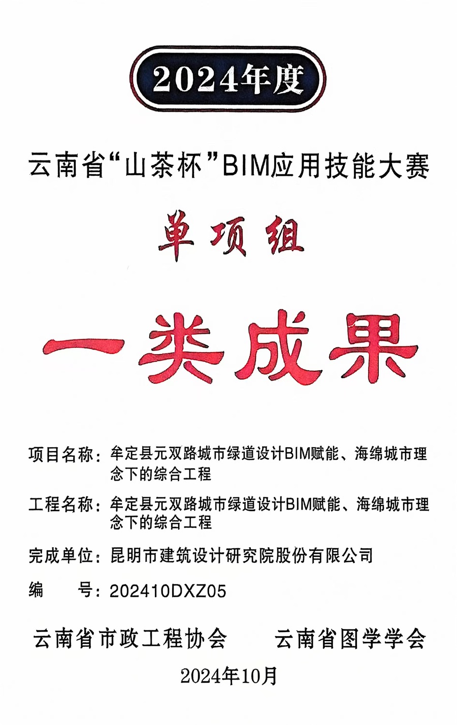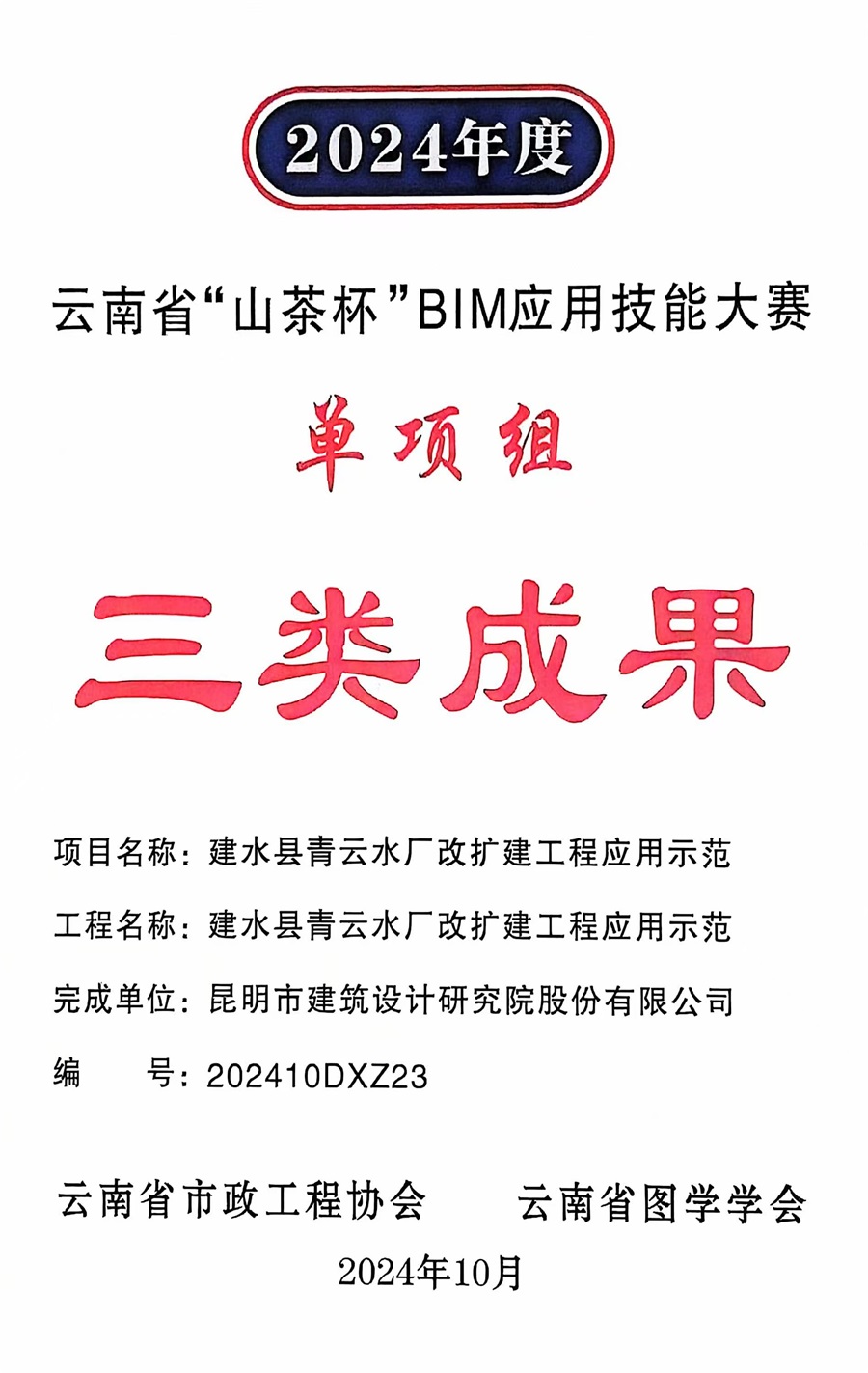 12月19日,在云南省第三屆(2024年)“山茶杯”BIM 應用技能大賽中,公司團隊參賽的“牟定縣元雙路城市綠道設計BIM賦能、海綿城市理念下的綜合工程”項目榮獲“單項組一類成果獎”,參與人員張建濤、李艷玲、何亮、鄭欣欣、陳烈、孔容杰、劉奇、江瑩妍、令偉宏、王偉榮獲“個人優(yōu)秀創(chuàng)新獎”;“建水縣青云水廠改擴建工程應用示范”項目榮獲“單項組三類成果獎”,參與人員申偉弦、王一茹、王麗、溫紹波、顧寒飛、白立黎、李柯穎、殷博、張思玉則榮獲該項目的“個人優(yōu)秀創(chuàng)新獎”。