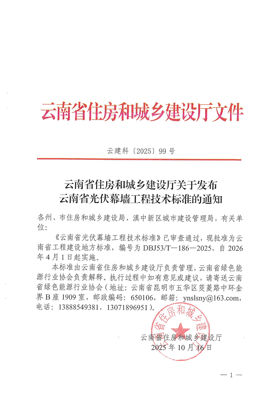 日前,云南省住房和城鄉(xiāng)建設(shè)廳發(fā)布了《關(guān)于發(fā)布云南省光伏幕墻工程技術(shù)標(biāo)準(zhǔn)的通知(云建科(2025)99號)》,由“昆明市院”等3家單位主編、22家單位參編的又一部云南省工程建設(shè)地方標(biāo)準(zhǔn)《云南省光伏幕墻工程技術(shù)標(biāo)準(zhǔn)》,獲云南省住建廳批準(zhǔn)正式頒布實施。