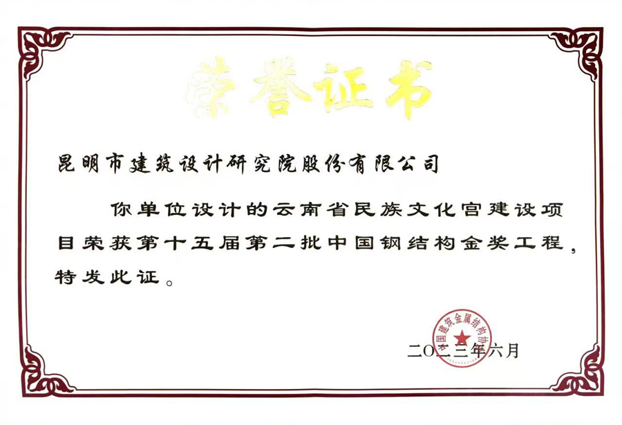 “鋼結(jié)構(gòu)金獎(jiǎng)”,中國(guó)鋼結(jié)構(gòu)領(lǐng)域的最高質(zhì)量管理獎(jiǎng)項(xiàng)、中國(guó)建筑鋼結(jié)構(gòu)行業(yè)工程質(zhì)量最高榮譽(yù),充分彰顯了公司在鋼結(jié)構(gòu)建筑領(lǐng)域同樣具備高超水準(zhǔn)、建筑傳承與創(chuàng)新的理念,以及對(duì)多元民族文化的詮釋能力。這是“昆明市院”幾代人對(duì)技術(shù)創(chuàng)新和質(zhì)量管理幾十年常抓不懈的結(jié)果。希望大家再接再厲,為云南省的城鄉(xiāng)建設(shè)奉獻(xiàn)更多優(yōu)秀作品,以?xún)?yōu)異成績(jī)回報(bào)這個(gè)偉大時(shí)代!