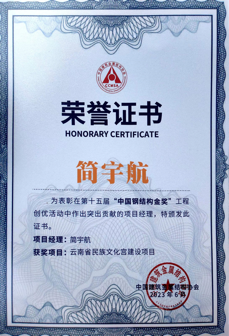 日前,中國(guó)建筑金屬結(jié)構(gòu)協(xié)會(huì)公布了第十五屆第二批“中國(guó)鋼結(jié)構(gòu)金獎(jiǎng)”獲獎(jiǎng)項(xiàng)目名單,公司擔(dān)綱設(shè)計(jì)的云南省民族文化宮建設(shè)項(xiàng)目和簡(jiǎn)宇航個(gè)人獲獎(jiǎng),其中公司榮獲“第十五屆第二批中國(guó)鋼結(jié)構(gòu)金獎(jiǎng)工程”,而該項(xiàng)目的設(shè)計(jì)負(fù)責(zé)人、公司總工程師簡(jiǎn)宇航則榮獲“突出貢獻(xiàn)項(xiàng)目經(jīng)理”稱(chēng)號(hào)。
