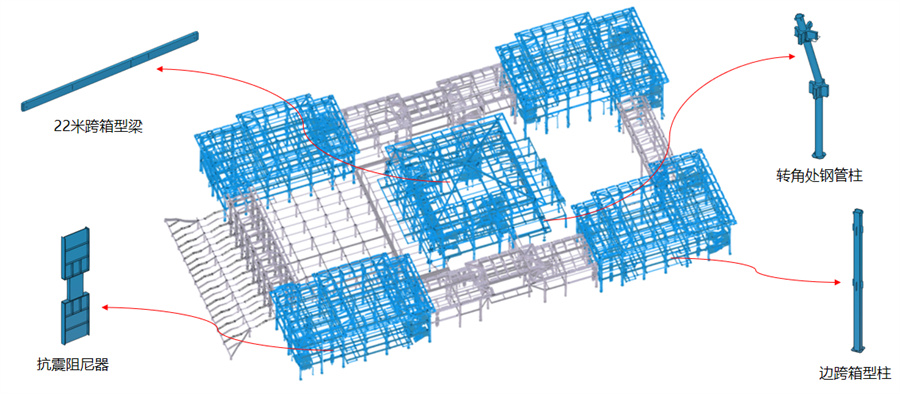 項(xiàng)目總建筑面積31900㎡,設(shè)計(jì)使用年限50年,主體建筑為地上三層,局部設(shè)置地下一層,主體結(jié)構(gòu)為多層鋼框架結(jié)構(gòu)體系,并采用抗震性能較好的減震技術(shù),消能器為剪切型軟鋼阻尼器。建筑高度為20米,鋼梁最大跨度為23米。鋼柱截面主要形式為箱型柱及圓管柱,鋼梁截面主要形式為焊接H型鋼及箱型鋼梁。