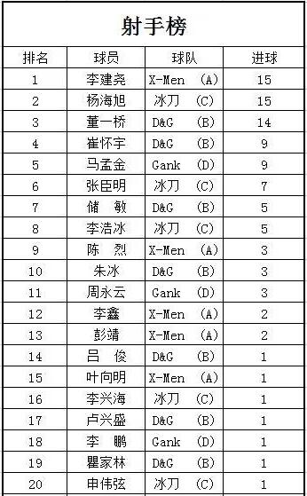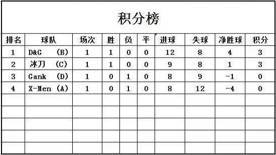 本場比賽中,D&G隊以12:8力勝X-men隊;冰刀隊以9:8力勝Gank隊。D&G隊以3分的積分,4個進勝球暫列積分榜榜首;冰刀隊以3分的積分,1個進勝球暫列積分榜次席;Gank隊和X-Men隊暫以0分的積分墊底。其中楊海旭和李建堯以累計15個進球數位居射手榜榜首。